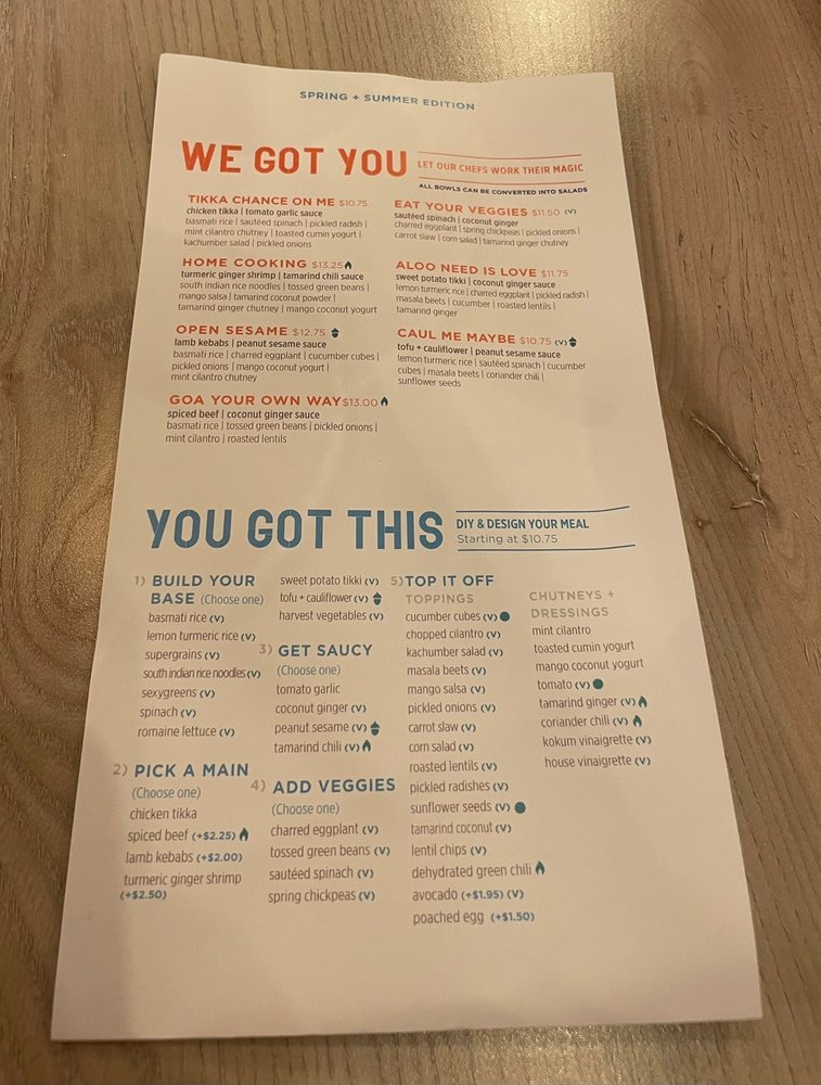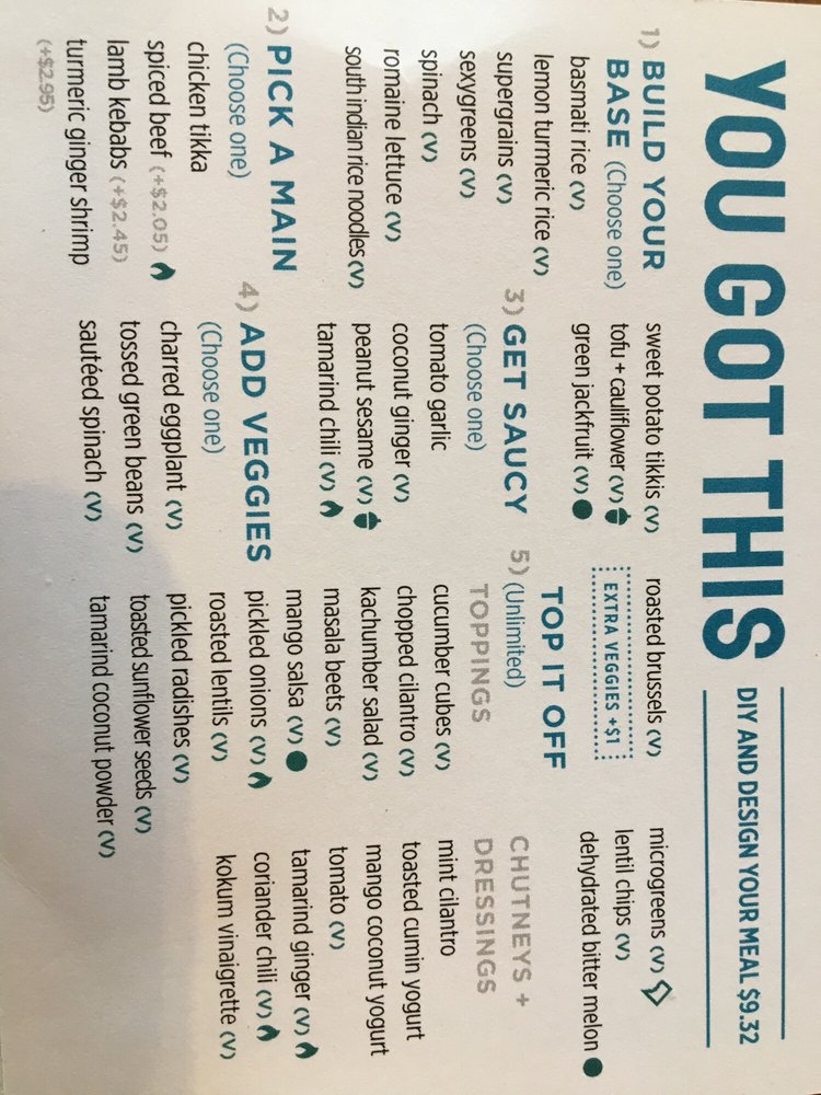 masala yogurt | lemon turmeric rice | chicken tikka | tomato garlic sauce | spiced chickpeas | romaine | pickled onions | shredded paneer | mint cilantro chutney | roti [halal]